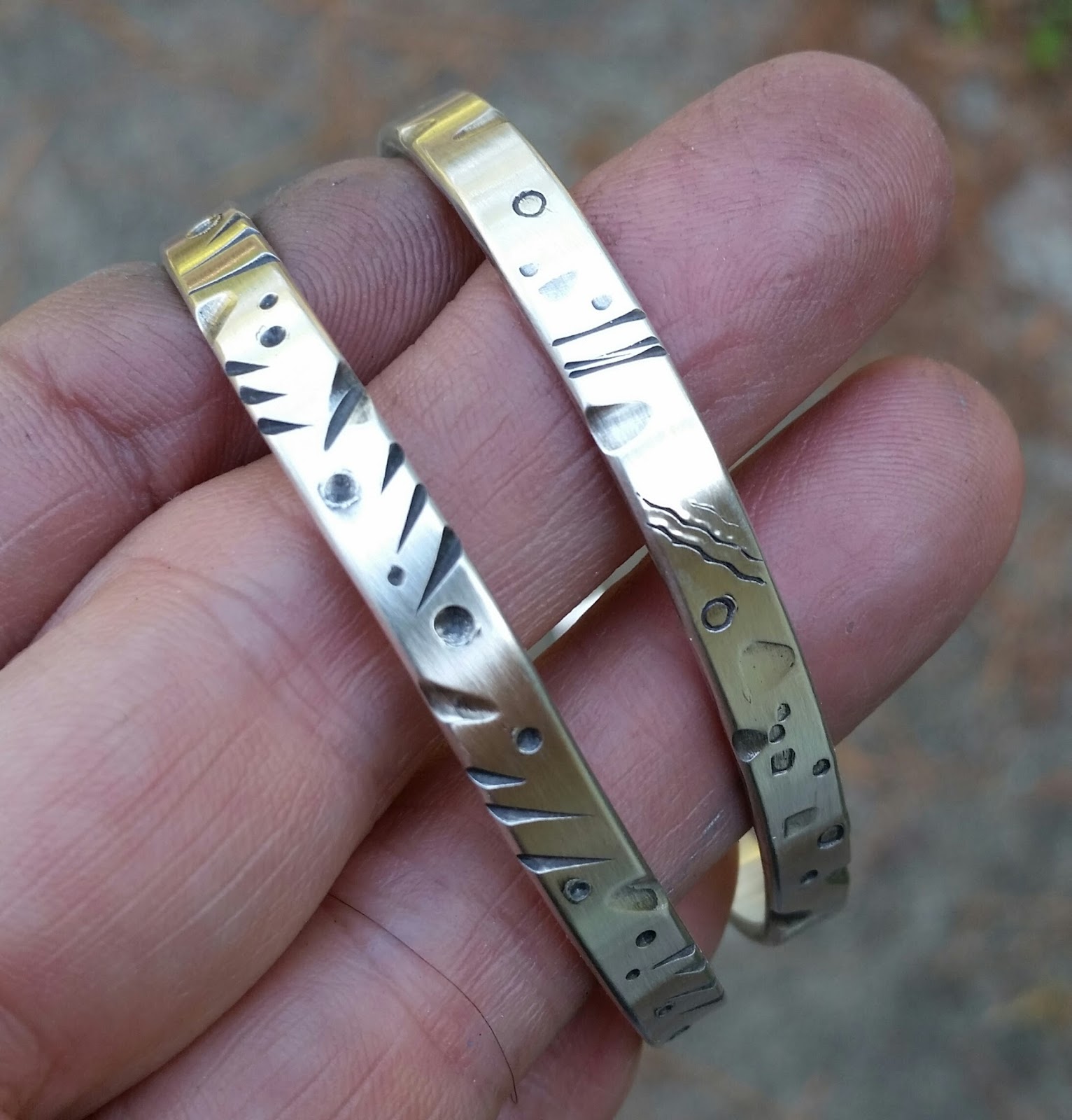 I usually try to work in series, It helps to keep my brain from going on random access and just making anything that comes into my head, Sometimes I just cant help it. This is one of those times. So the question is What do I call these? What series can I put them in? I did some circle pendants last fall with a similar look but I called them circle of life pendants. Can I call these circle of life bracelets? Maybe if they were bangles? Maybe I'll cut them into links and add some small stones? Feel free to comment