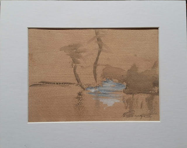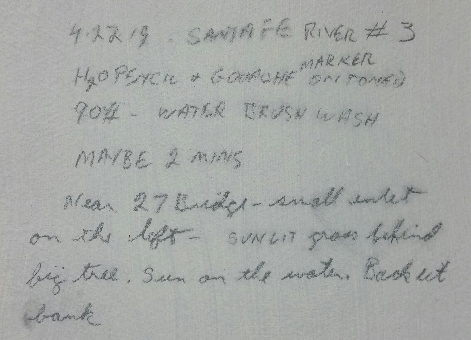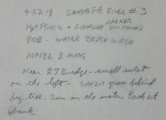I was prepared to work fast with watercolor pencil and markers, but this was crazy fast. No sooner did I get the paper out than I had to correct course and get back to the middle and out of the weeds. Then look down at my bag and get a pencil, look up and quickly find my composition again. But in that short time, I had moved, the view was different. I dashed in a few lines and grabbed the water brush and to get a quick wash going from the Elegant Writer or the Dark Wash Derwent graphite pencil. I was using paper that I had previously gessoed with a neutral color so I was concentrating on getting the dark's and lights. Shadow patterns and reflections. That is a lot to ask for in a 30 sec sketch There was no going back. Not only would I have to turn around and go back up stream, but I was falling behind the other boats and after each sketch I would have to paddle like a mad man to catch up. Over the course of the 3 hour float I got 5 sketches. However I didn't get any real reference shots because the picture I took after the sketch would have to be behind me! I wrote on the back of each one what I was doing and where.